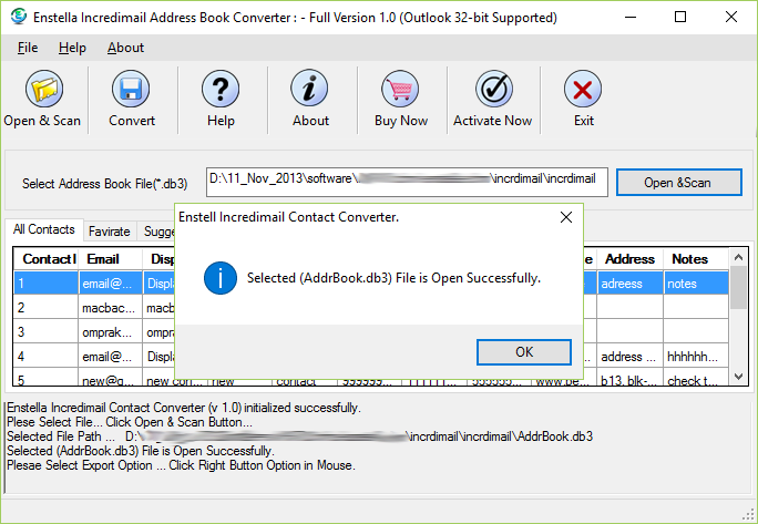 Get confirmation message of successful AddrBook.db3 file scanning, after IncrediMail Address Book Converter tool completes the process of AddrBook.db3 file scanning and show the confirmation message