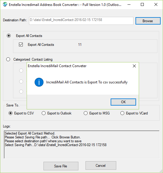 Converting of IncrediMail All Contacts is Export to csv File has been completed successfully