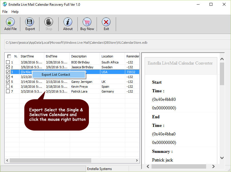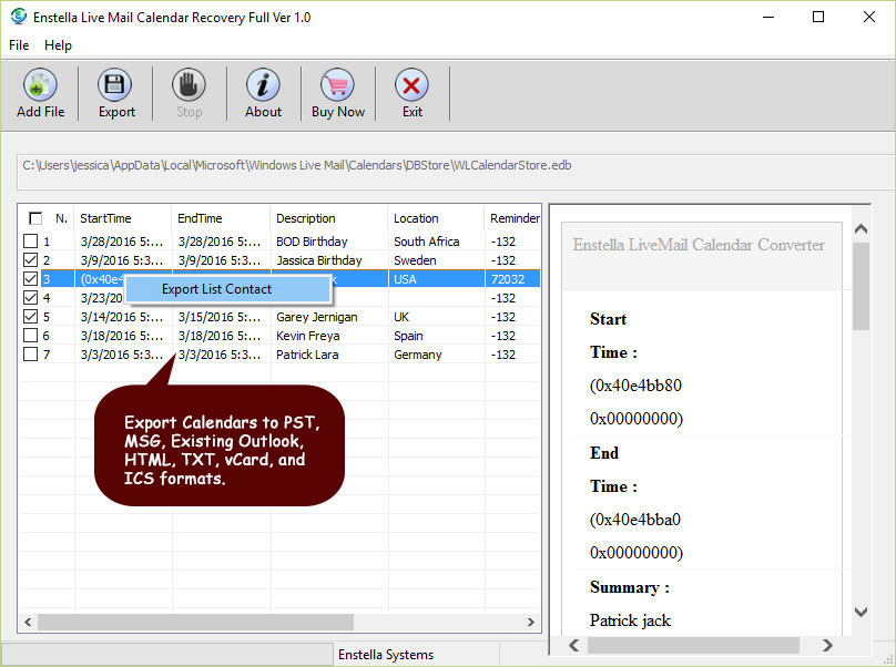 Have preview of recovered calendar, and click on Export button to save Live mail Calendar .edb file