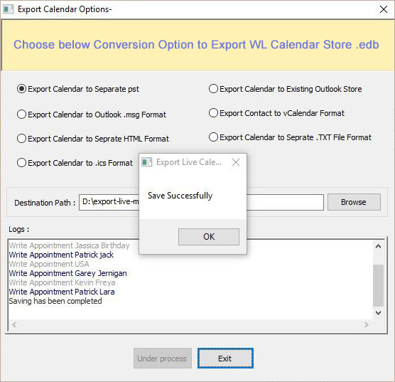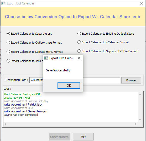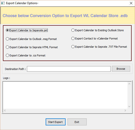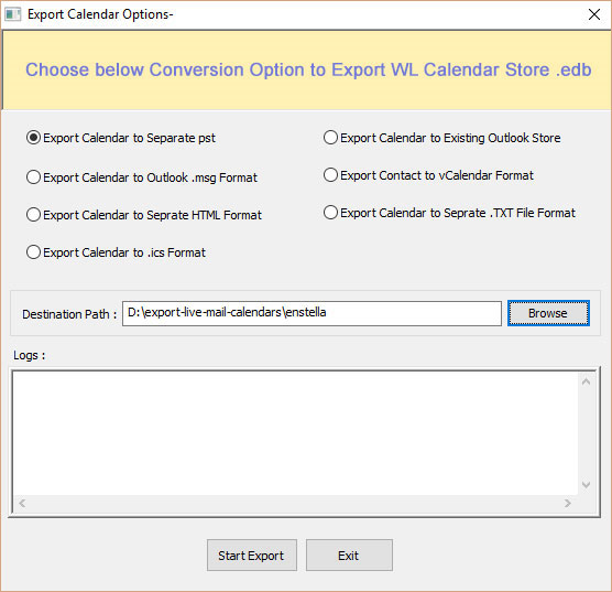 Export Calendars to PST, Existing Outlook Store,MSG,vCard, HTML,CSV and TXT