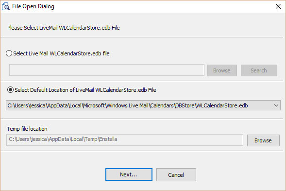 Select the Default Location of Live Mail Calendars.edb file, And cilck on the Next button