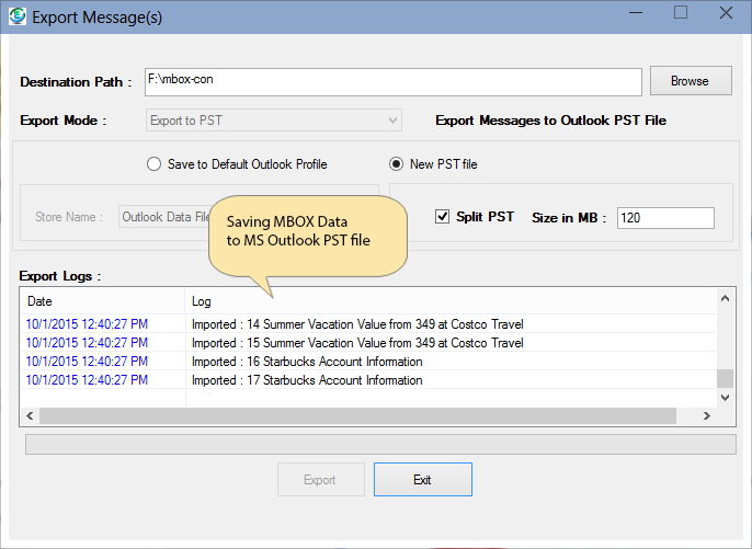 After clicking Export button, you will get saving of MBOX file data to PST file