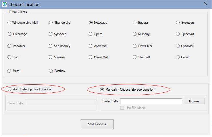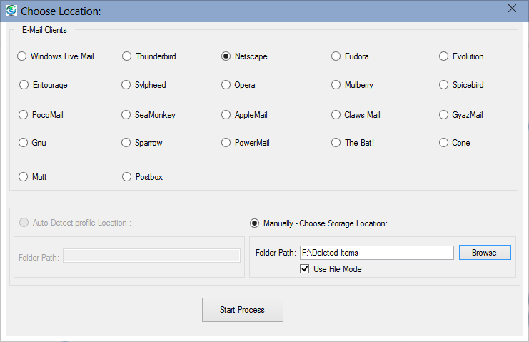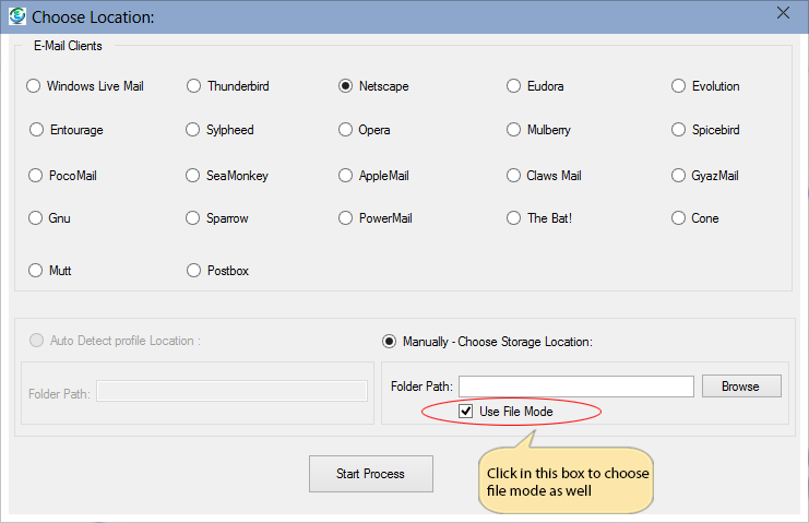 In Manually Choose Storage Location our software gives you "Use File Mode" that will helps you to choose file
