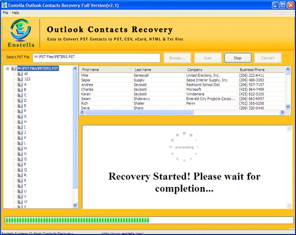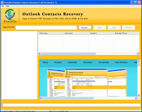Step-by-step Enstella Outlook Contact Recovery Software Working & See how its working and Recover PST Contact to PST, VCF, CSV, HTML and TXT format.